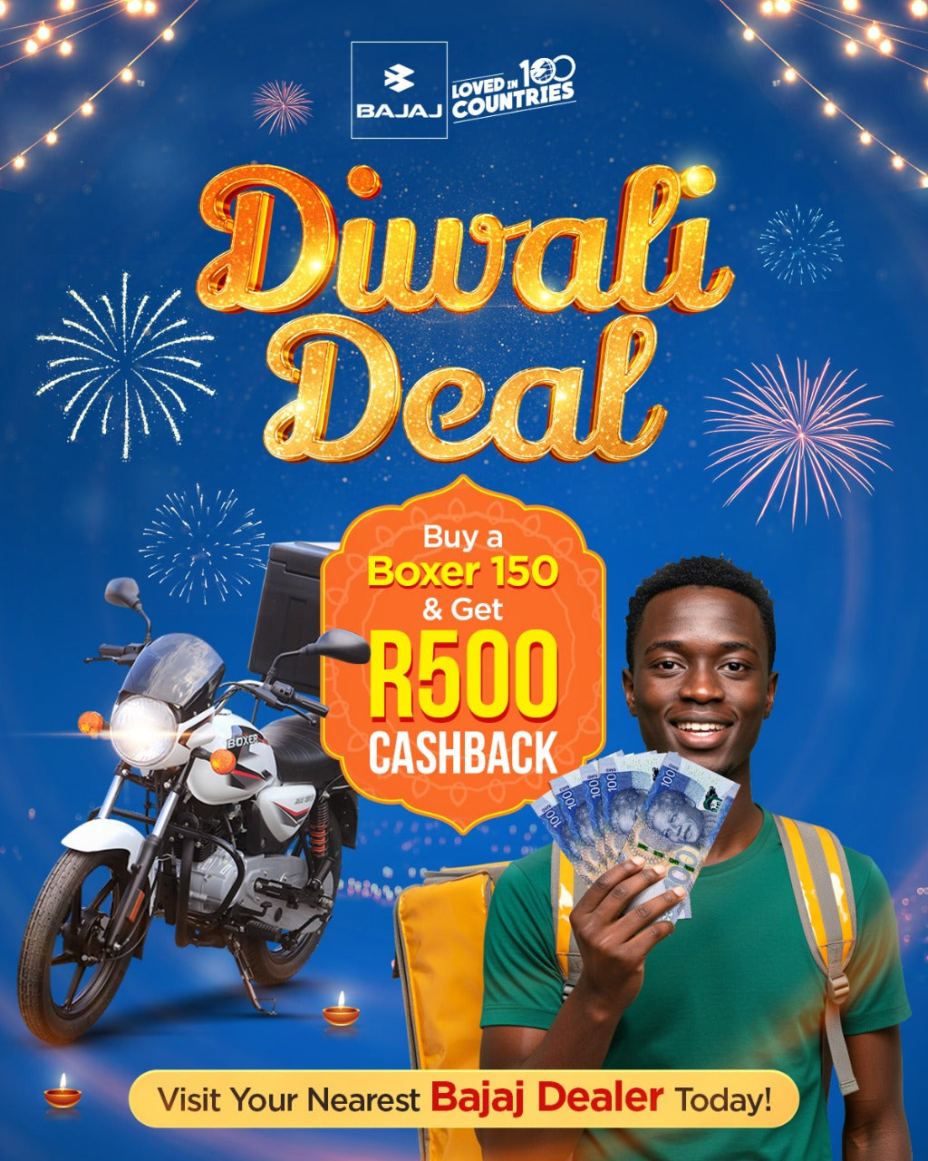 We’re celebrating Diwali nationwide with R500 cash back on every Bajaj Boxer sold ,paid directly by us or discounted from your final deal price.